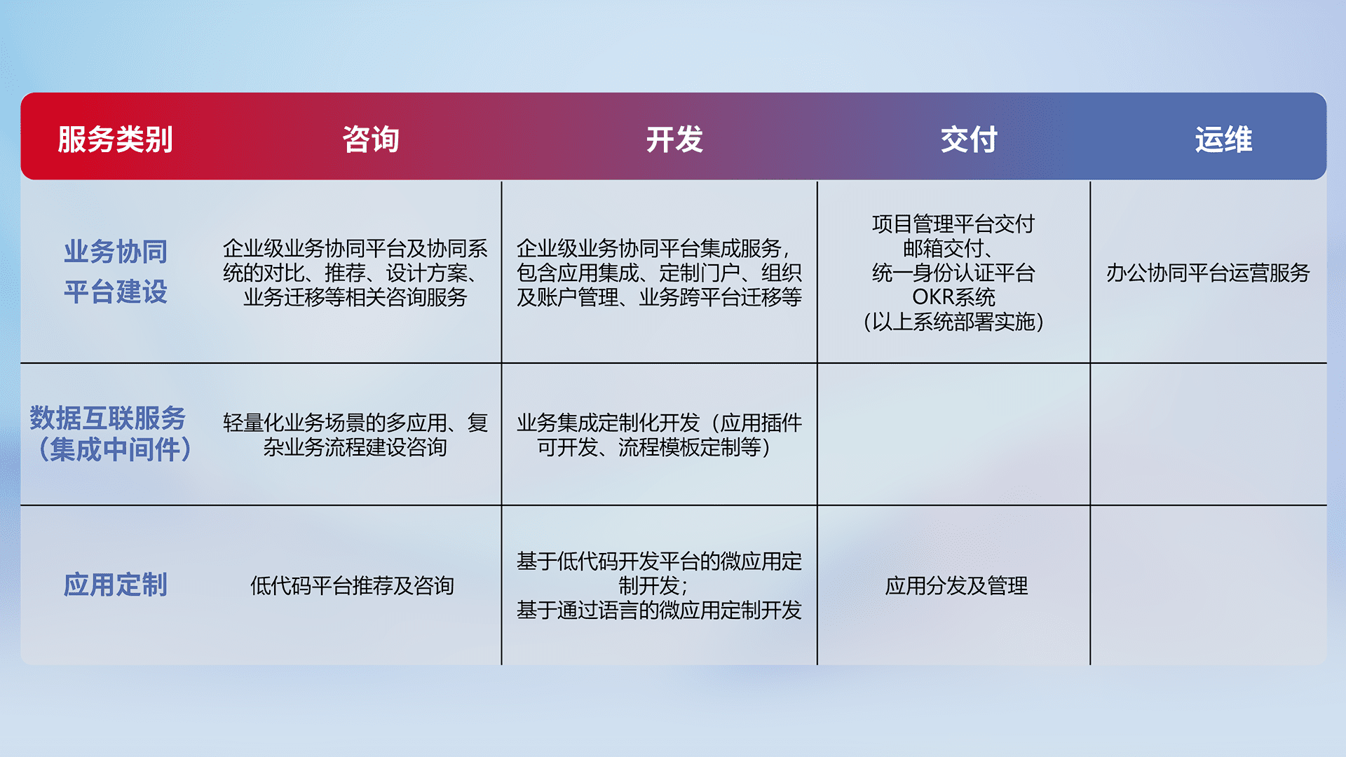针对钉钉、、企微、、IDaas等平台级产品提供产品的规划、、、方案、、交付、、定制化开发等服务,,实现如统一协同办公、、、、智能客户服务、、混合会议管理、、、、智能数据查询、、、等业务场景,,,,实现数字化转型。。。